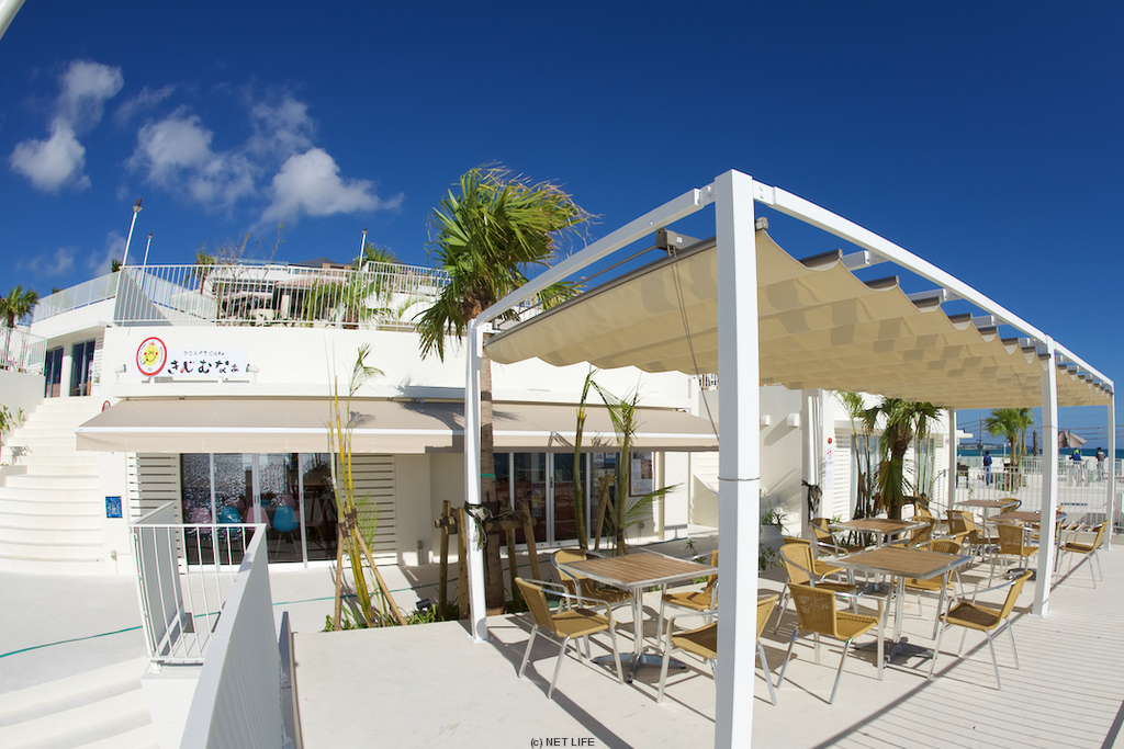 白いパーゴラが目を引く、きじむなぁウミカジテラス店では連日大変多くのお客様にご利用いただいております。沖縄を発つ前のひと時をタコライスとビールを片手に楽しんでください。空港までの無料の送迎バスもございます。