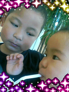 コメント 4才と1才の息子達。真剣にジュースを飲んでる弟を見て思わず「いいなぁ〜俺にも飲ませろ〜!」って顔をしてるお兄ちゃん(^_^;)かわいい\(≧▽≦)丿(親バカでゴメンナサイぃぃ)