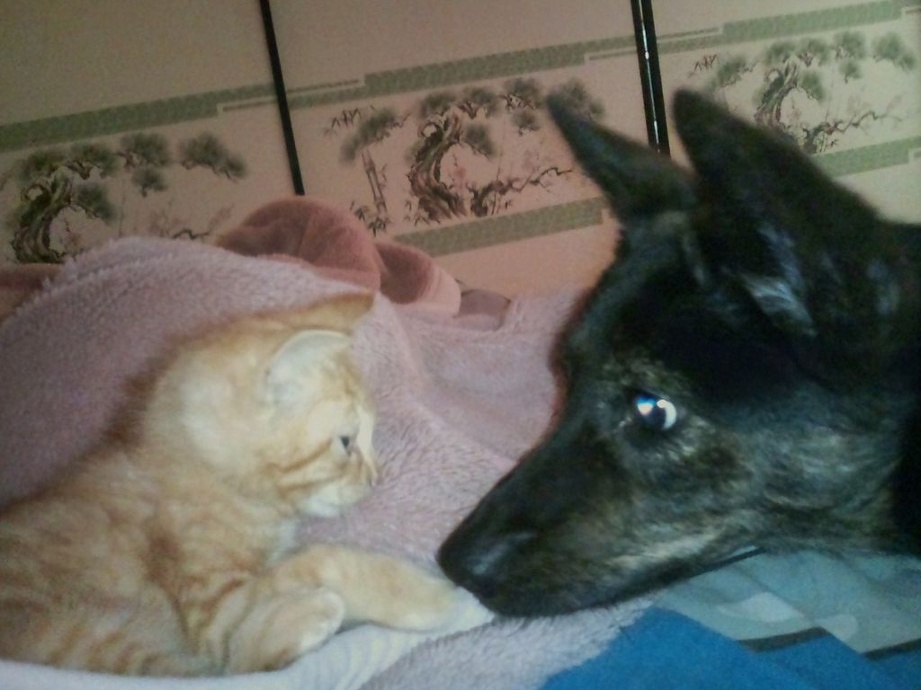 | コメント | イントゥマヤー(犬と猫)仲の悪いたとえ。ですが、見つめ合っててとても仲が良いですね!母親だと思ってたりして♪ |