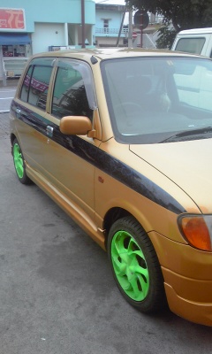 横の黒のラインと蛍光色の社外ホイールも上等ですね!