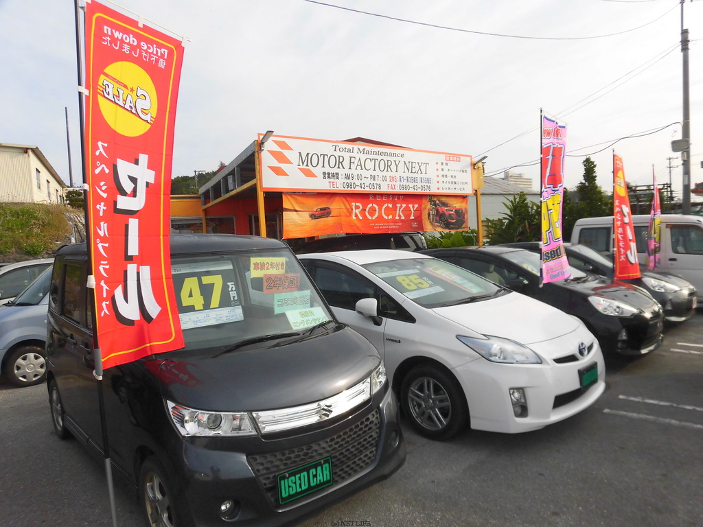 | 名護市屋部にあります、新車・中古車販売店のMOTOR FACTORY NEXT です。車検・鈑金・修理・レッカーサービス・コーティングなど取り扱っております。 | |||||||||||||